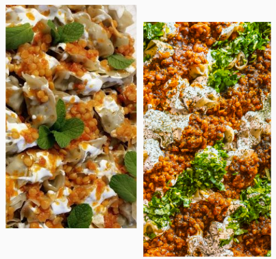 Dumpling stuffed with onions, ground meat (veal), and fresh mint with yogurt sauce on top